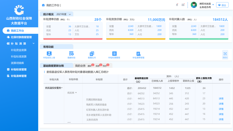 總體目標: 采用節約、高效、安全原則,實(shí)現與各業(yè)務(wù)部門(mén)及資金使用單位等用戶(hù)對社保補貼信息審核和管理的關(guān)口前移,達到對補貼對象準確識別、補貼標準精準匹配、補貼金額精準測算等。解決入口端的全面性、真實(shí)性問(wèn)題入口端:對全省人社、民政、衛健、退役軍人事務(wù)等業(yè)務(wù)部門(mén)管理的社會(huì )保障對象基本信息等數據進(jìn)行分類(lèi)、導入、更新,并做好信息在線(xiàn)查詢(xún)、在線(xiàn)比對、在線(xiàn)統計,實(shí)現數據的互聯(lián)互通,形成統一基礎信息數據庫解決中間端的真實(shí)性、精準性問(wèn)題中間端:對補貼對象精準識別、補貼標準精準匹配、補貼金額精準測算等多方面的綜合業(yè)務(wù)服務(wù)解決出口端統一“一卡”發(fā)放問(wèn)題實(shí)現與財政預算管理一體化、直達資金、惠民惠農財政補貼資金“一卡通”平臺的對接,實(shí)現信息的互聯(lián)互通和部門(mén)數據共享。